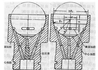 为了达到f2<f1,图6-28(b)提供了性能良好的柱塞结构。在球面静压支承中,除中心油腔外,在四周还对称布置着四个油腔,以增大强制滑润效果和钢球在偏心运动情况下的各向承载能力。其球面则由三段圆弧组成,可使球窝部的静压和动压效应更好地发挥作用。应当说明一下,宁波液压马达厂生产的QJM、QKM系列马达,已在球窝中嵌入了一层填充改性的(聚四氟乙烯(PTFE)SF-1型自润滑复合材料。SF-1型材料类同于英国梅拉西尔的(青铜粉层的)DU、DX材料,它还有经过精心筛选的塑料配方加以青铜丝网,因此,具有十分理想的耐疲劳、低摩擦系数,承载能力强,寿命长等优点。